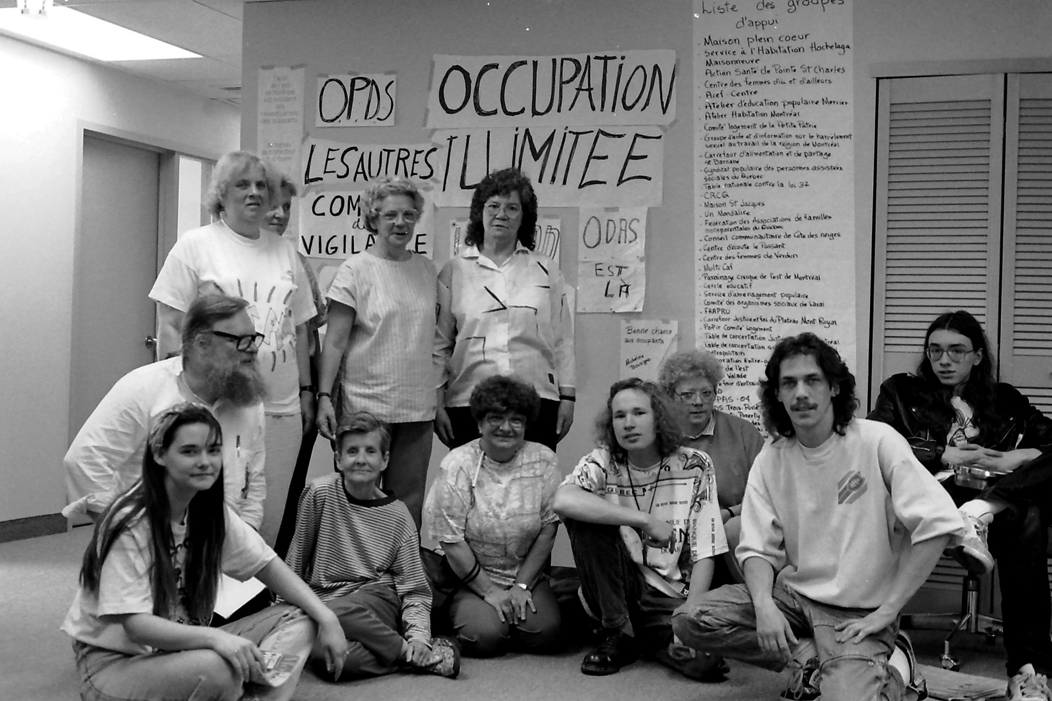 En 1992, en avril, on a occupé une journée la Direction des communications du ministère de la main-d’œuvre. La police suivait les autobus et l’anti-émeute a couru après nous. Mais un autobus complet a pu entrer. On préparait aussi une longue série d’actions, pour le mois de mai. Le 25 mai, on occupait le bureau du ministre du travail, puis, le 26 mai, on occupait le bureau du Protecteur du citoyen, occupation qui allait durer 14 jours. On voulait rencontrer Bourassa pour lui porter nos revendications. On a reçu plein d’appels du bureau de Bourassa, tout le monde voulait nous voir sauf lui. On nous promettait qu’il nous rencontrerait plus tard. On n’a pas bougé et la police nous a sorti à la demande du protecteur qui nous avait gardé jusqu’à la visite des artistes qui nous ont appuyées, dont Yvon Deschamps, Nathalie Gascon, Richard Desjardins, Pauline Martin, Richard Séguin, Gilles Vigneault et Laurence Jalbert.