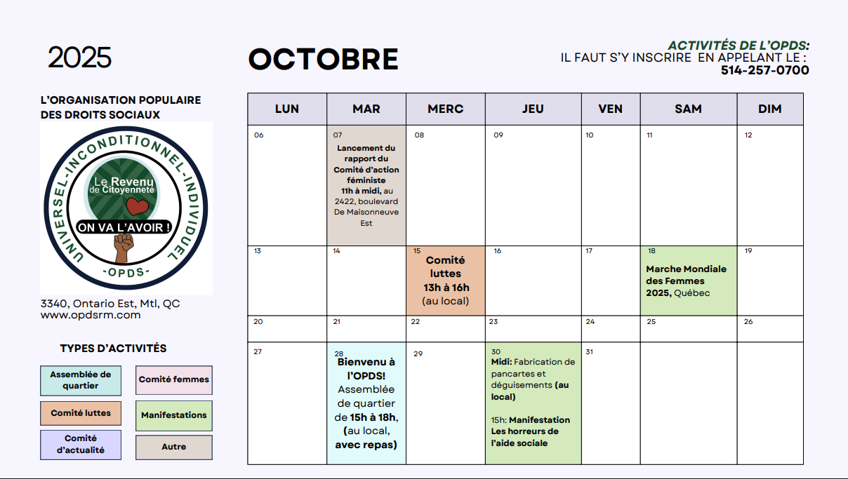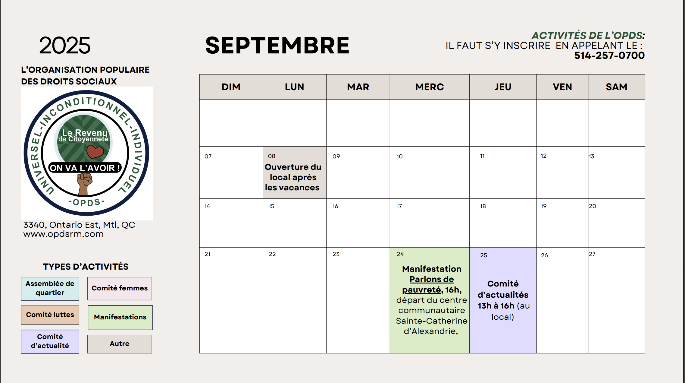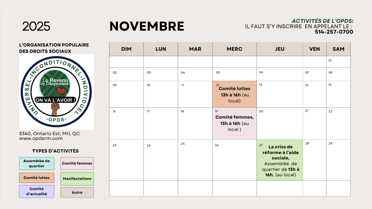Activités mensuelles Pour poser des questions ou vous inscrire à nos activités, appelez-nous au 514-322-5782 ou au 514-527-0700 !